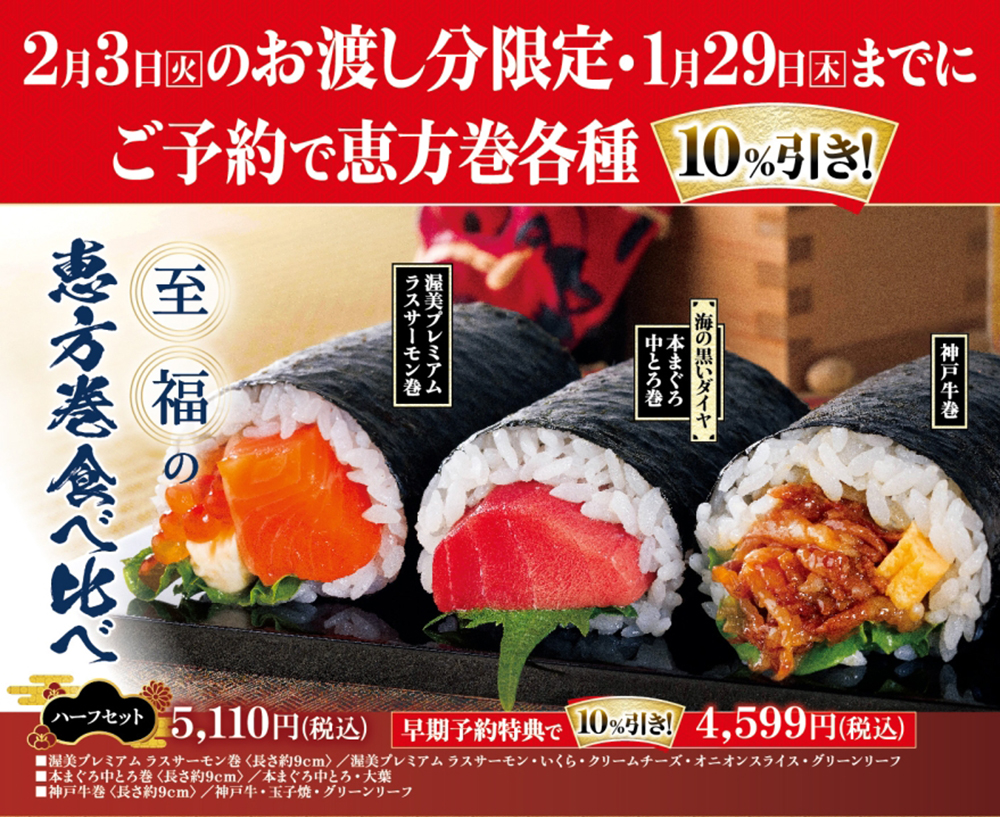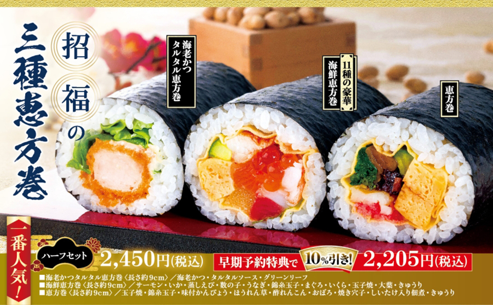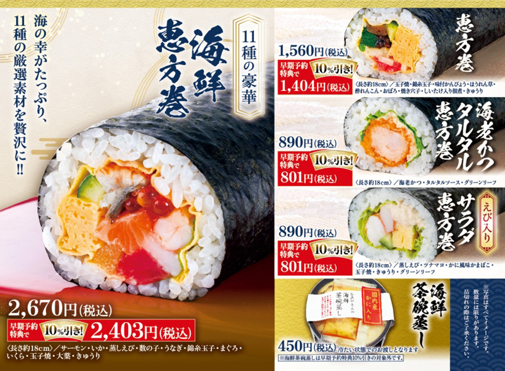さらに早期予約特典として、2月3日(火)お渡し分限定で、1月29日(木)までにご予約で恵方巻各種を10%引きにてご提供いたします。