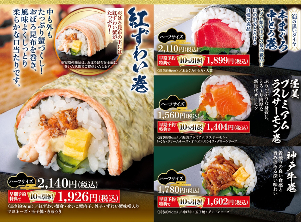 中も外も蟹たっぷりの新作「紅ずわい巻」をはじめ、本まぐろ中とろ、渥美プレミアムラスサーモン、神戸牛など具材にもこだわった恵方巻を