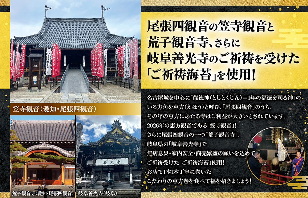 今年は、尾張四観音の笠寺観音と荒子観音寺、さらに岐阜善光寺のご祈祷を受けた「ご祈祷海苔」を使用!